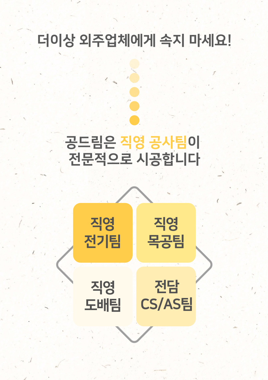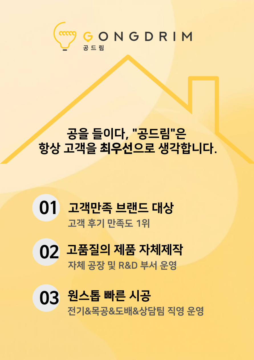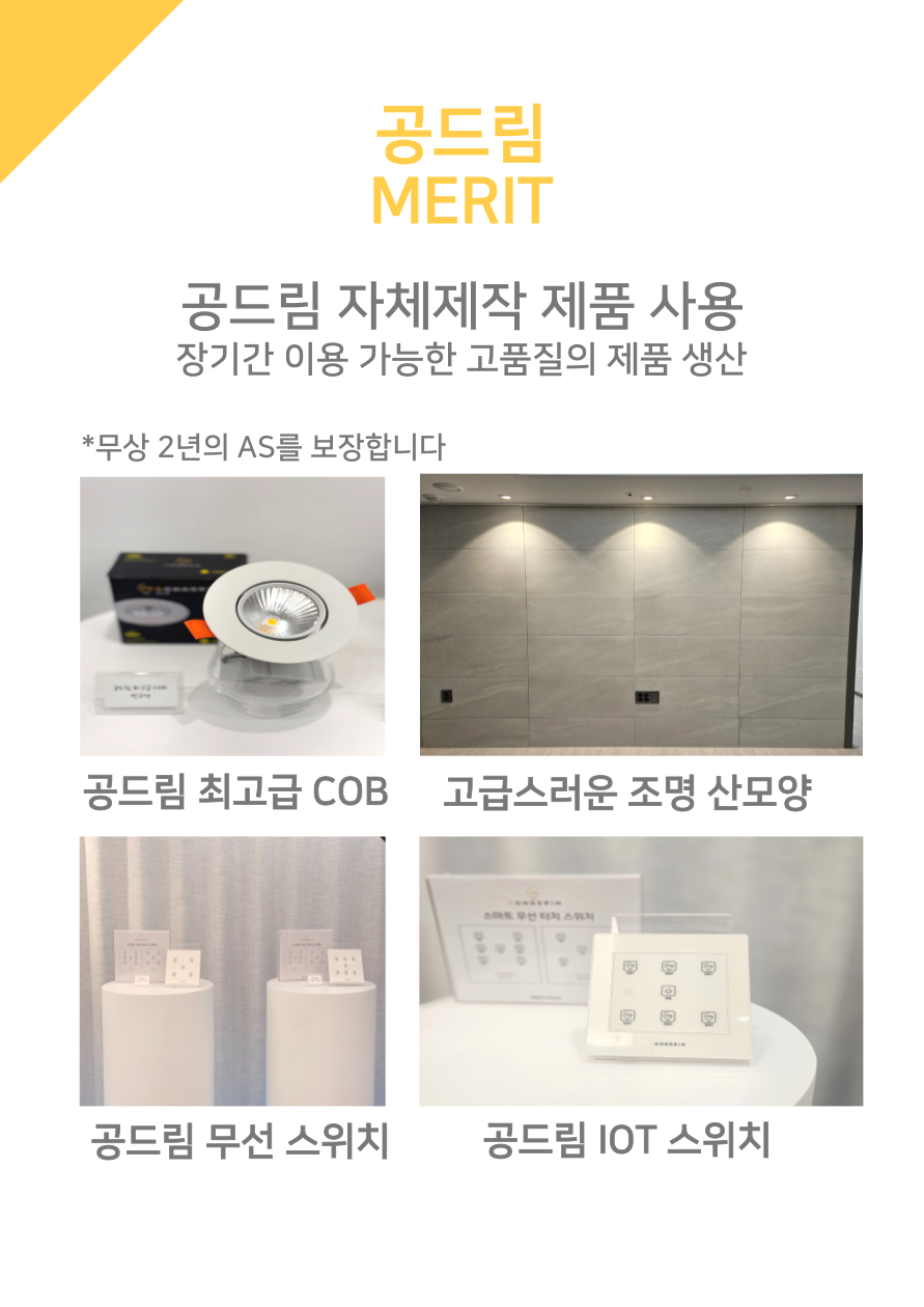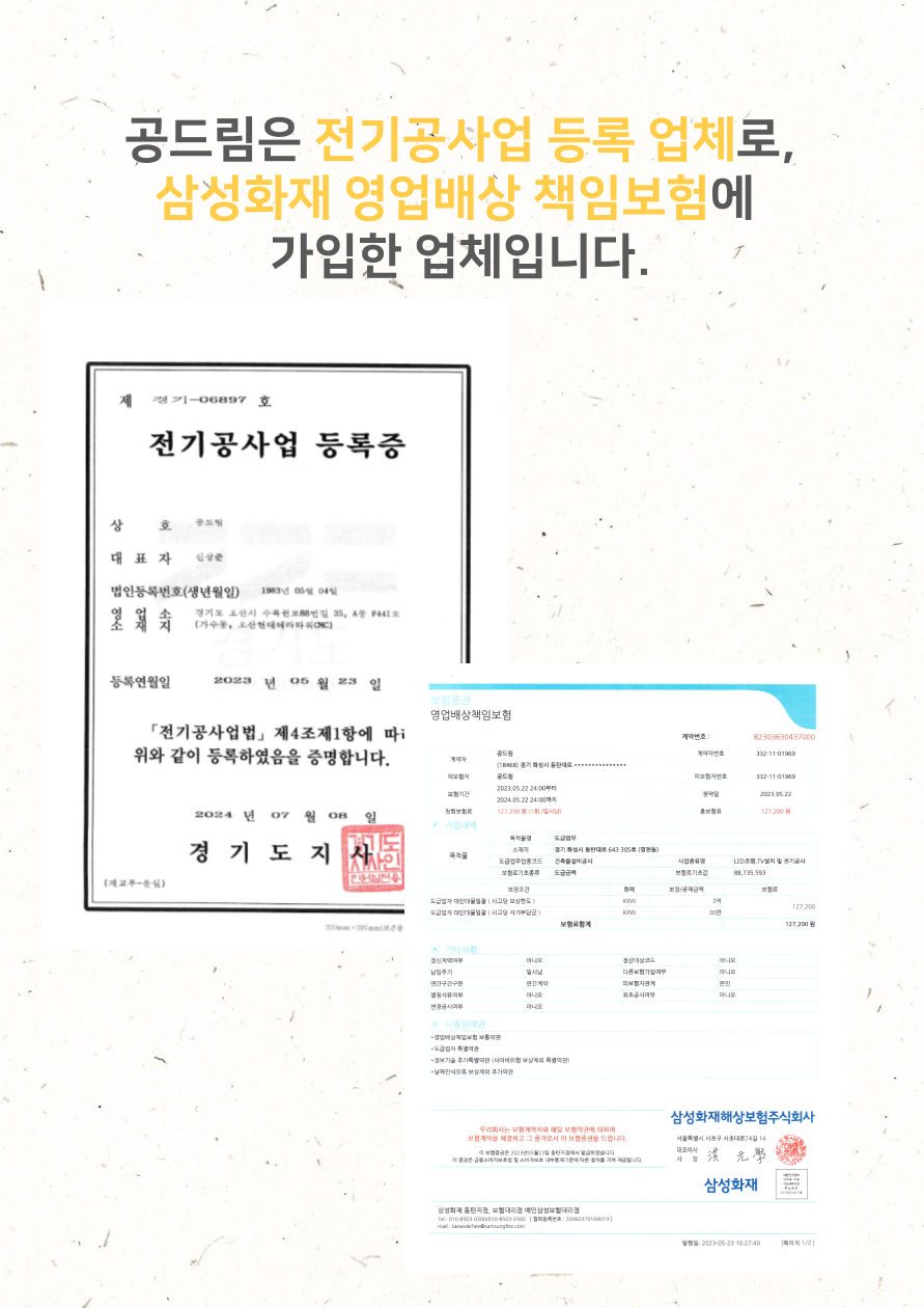 저희 공드림은 뛰어난 기술력으로 LED조명부터 벽걸이TV, LED시계, 콘센트 증설 등 원스톱으로 시공하시고 싶은 품목을 한번에 시공 받으실 수 있습니다.
