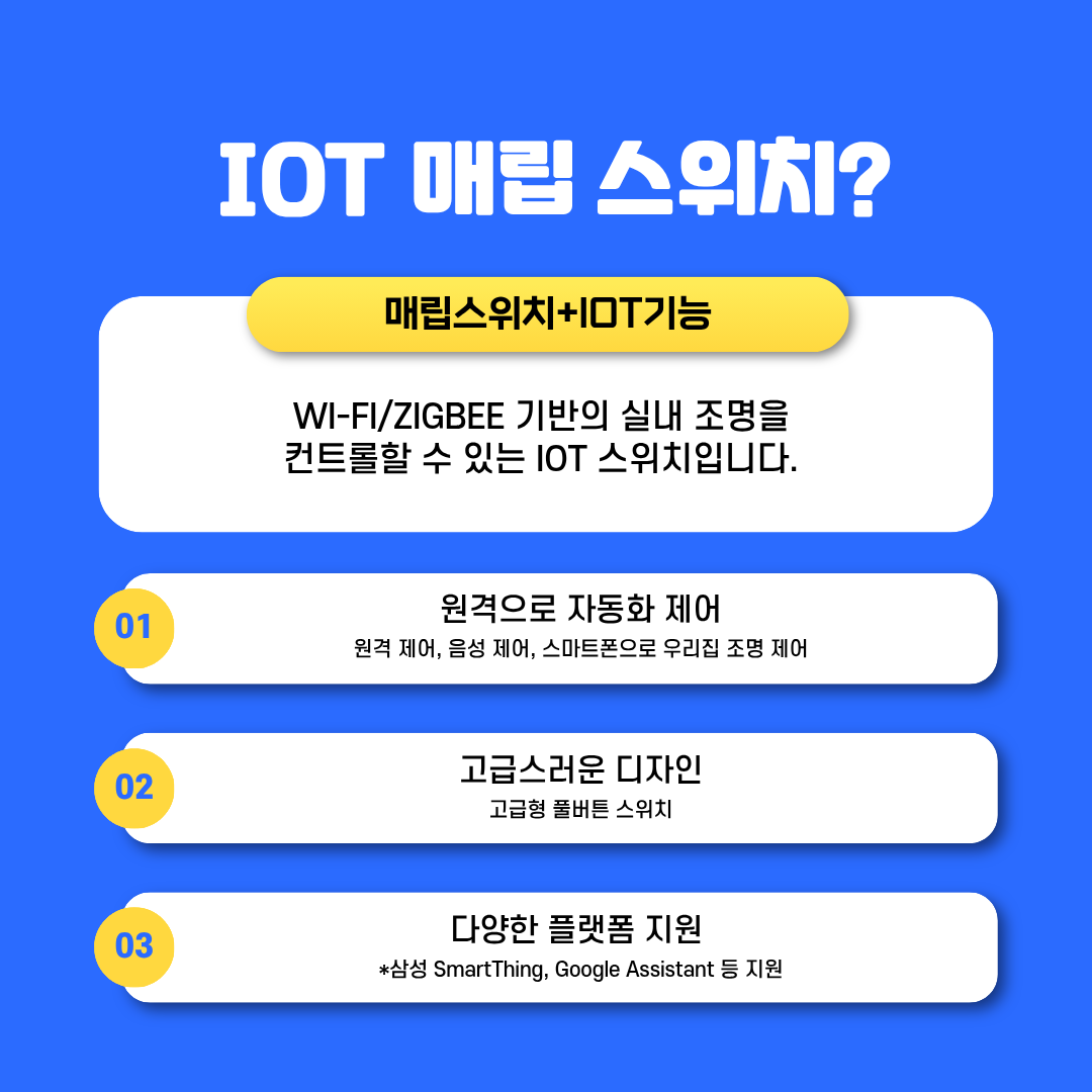IOT 기능을 포함하여 편리하게 사용하실 수 있는 스위치입니다. 매립 스위치의 장점과 IOT 스위치의 장점을 모두 누릴 수 있는 최고급 스위치입니다.